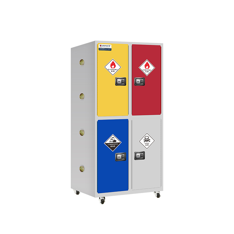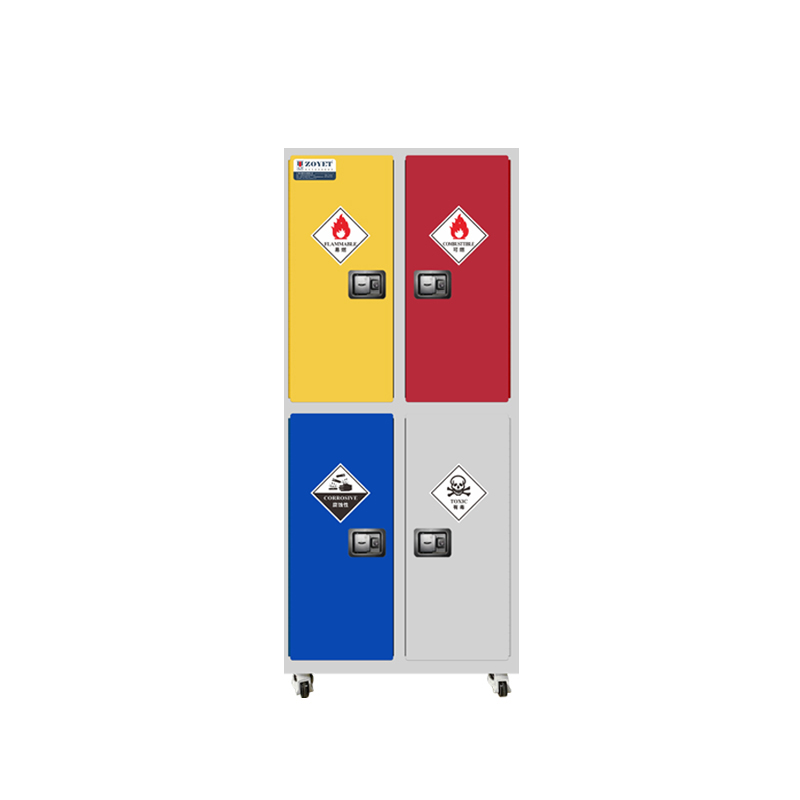 - 底部装有四个移动轮可手动调节高度,方便危化品储存柜定位及整体移动;