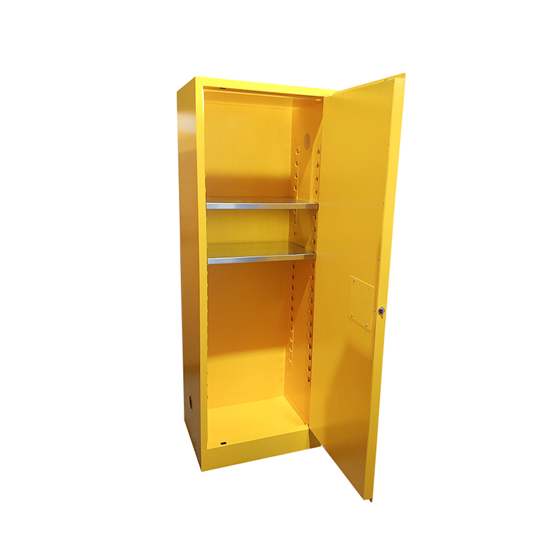 - 易燃液体安全柜由双层1.2mm钢板通过点焊接构造,整体为双层防火钢板结构,两层钢板之间有 38mm 的防火层,有效防火绝缘;
