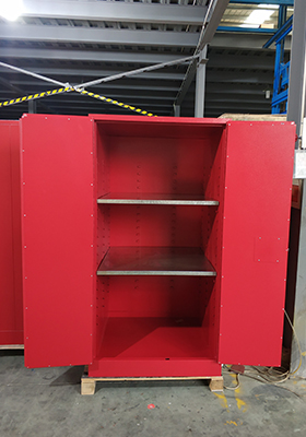 - 易燃液体安全柜由双层1.2mm钢板通过点焊接构造,整体为双层防火钢板结构,两层钢板之间有 38mm 的防火层,有效防火绝缘;