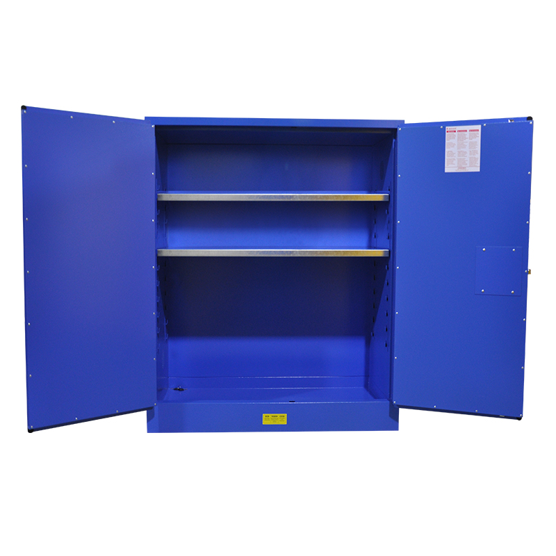 2. 易燃液体安全柜由双层1.2mm钢板通过点焊接构造,整体为双层防火钢板结构,两层钢板之间有 38mm 的防火层,有效防火绝缘;